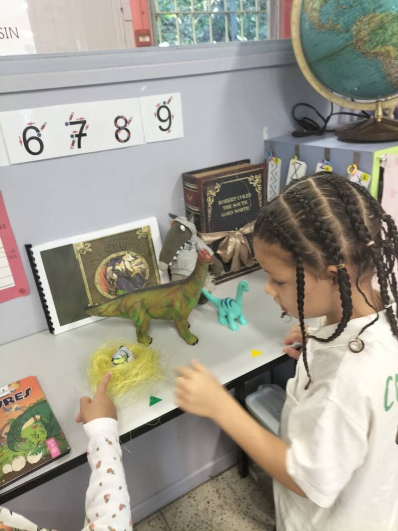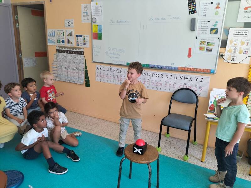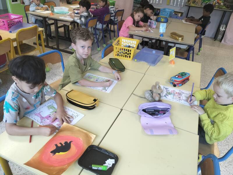 Après la découverte d'un vieux grimoire magique, Loup, la mascotte de la classe de Grande Section, s'est retrouvé au temps des dinosaures. Il nous a rapporté quelques objets de cette période de l'histoire: un œuf de dinosaure et des albums pour mieux connaître les dinosaures. En classe, nous nous sommes glissés dans la peau d'un archéologue. Nous avons réalisé des fouilles pour déterrer des os de T-Rex. Nous avons confectionné des fossiles de dinosaures en pâte à sel. Nous avons eu la chance de voir l'oeuf éclore et d'accueillir un petit stégosaure! Nos œuvres d'arts de sont aussi inspirées de nos nouveaux amis les dinosaures. Nous attendons avec impatience le prochain voyage de Loup pour faire de nouvelles découvertes sur notre histoire!